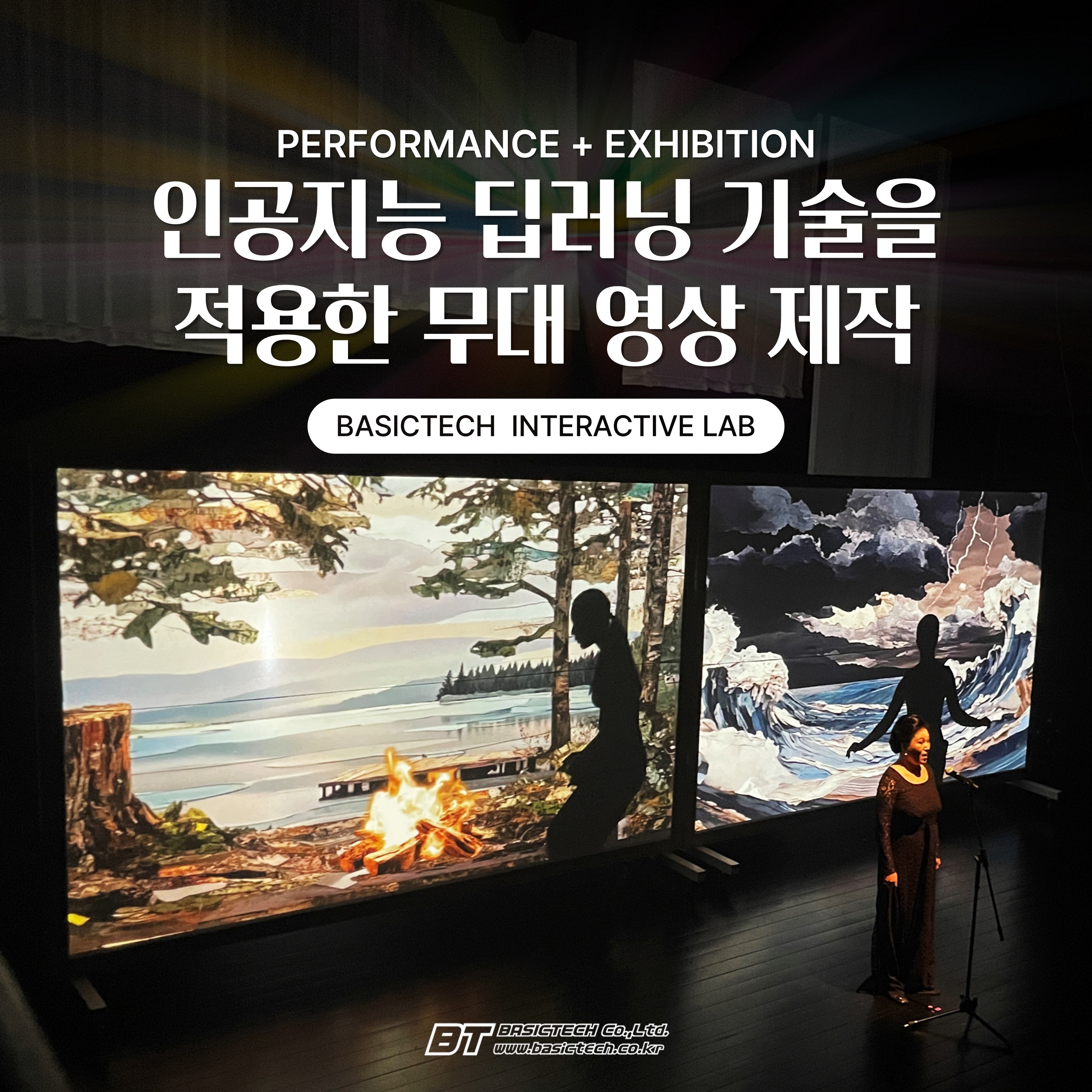 베이직테크의 '인터랙티브 랩' (이하 '인랩')은 예술과 기술의 경계를 허무는 혁신적인 융합을 통해 뉴미디어 시대의 새로운 가능성을 열어가고 있습니다. '인랩'의 핵심 목표는 사용자와의 깊이 있는 상호작용을 극대화하여 전에 없던 높은 만족도와 몰입감을 선사하는 것입니다. 이를 위해 저희는 사용자가 온몸으로 느끼고 체험하는 체감형 디지털 콘텐츠와 공간 자체에 완전히 몰입하게 하는 실감형 공간(이머시브 스페이스) 솔루션 제공에 집중하고 있습니다.